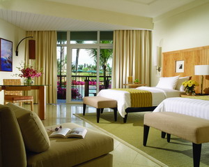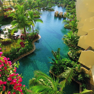 拥有500多间客房的三亚喜来登是目前海南拥有客房数量最多、客房最宽敞的度假酒店。房间极其舒适豪华,超大的床和浴缸令人心动;客用品也极显豪华,且十分齐备。倚立阳台,你可以尽情饱览亚龙湾壮观的一线全景,花木葱茏的热带花园、翠绿山景或高尔夫球场。所有能想象得到的亚热带美景,在这里全部真实可见。我们也迫不及待地被这种美景所诱惑,匆匆换上泳装,奔向清澈纯美的大海。当你尽情享受阳光、沙滩和海水之后,也一定不会拒绝掩映在摇曳的棕榈树和美丽的鲜花中的湛蓝泳池,那感觉将是另一番美妙。当然,你还可以选择各种海上娱乐活动:帆板、摩托艇、夜潜、深水钓鱼、滑水以及独木舟都极具激情和挑战。拖曳伞倍受宠爱的主要原因就是让人们能够在妙不可言的亚龙湾空中自由飞翔,然后伴着花香,在享受优雅的Spa中沉醉。正如英雄身边一定会有美女相伴,与喜来登相邻的亚龙湾18洞高尔夫球场以及中国唯一拥有6个标准杆球洞的红峡谷是高尔夫球迷户外运动的绝佳选择。