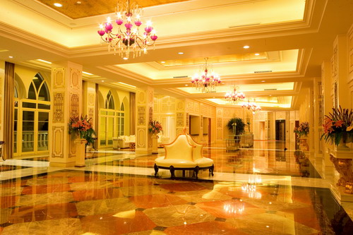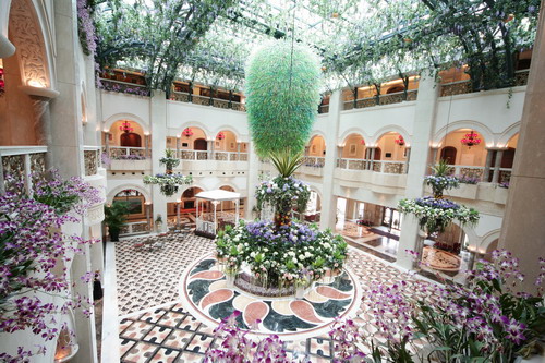 每值正午时分,耀眼的金色阳光从酒店花园式大堂的透明圆顶满泻而下,来唤醒环绕大堂的每层走廊露台上的各色花卉。大堂的吊灯生得极为趣致,形状各异的绿色灯管组合成的硕大圆锥形灯体底部,围绕着一圈细长的灯管,一条条水线顺着灯管轻盈滑落,直通地面上的圆型罗马池。在沁人心腹的阵阵清香中,天籁之音自大堂右侧的白色八角洋亭内传来,端坐亭中的金发少女怀抱金色的大竖琴,纤细的手指在琴弦上来回舞动,此时此刻,靠座于环绕水池的布艺沙发上,就着琴音流水,静静阅读一本好书,何等悠然。
